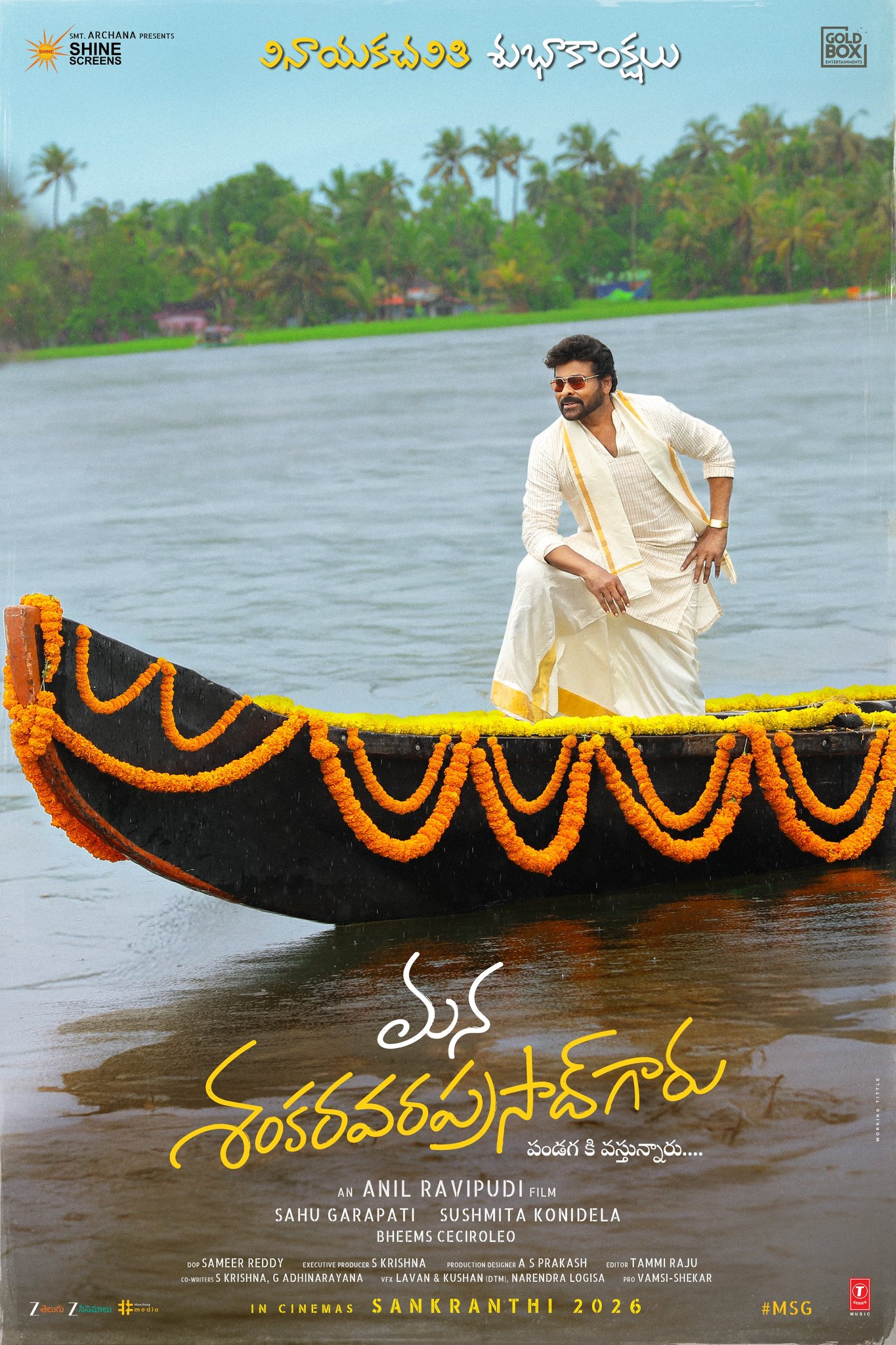 మెగాస్టార్ చిరంజీవి నటిస్తున్న మన శంకర వరప్రసాద్ సినిమా నుంచి వినాయక చవితి కానుకగా కొత్త పోస్టర్ విడుదలైంది. దర్శకుడు అనిల్ రావిపూడి తెరకెక్కిస్తున్న ఈ సినిమాలో చిరంజీవి డ్యూయెల్ రోల్లో కనిపించనున్నారు. మన శంకరవరప్రసాద్ గారు' సినిమా నుంచి కొత్త స్టిల్ లో చిరంజీవి షార్ట్ కుర్తా, పట్టు పంచె ధరించి సంప్రదాయంగా కనిపిస్తున్నారు. కళ్లద్దాలు పెట్టుకొని పడవ మీద స్టైల్ గా నిలబడి ఉన్న మెగా లుక్ అలరిస్తోంది. ఇటీవల కేరళ షెడ్యూల్ లో షూట్ చేసిన సాంగ్ లోని స్టిల్ అని తెలుస్తోంది. టైటిల్ గ్లింప్స్ లో చిరంజీవి నోట్లో సిగరెట్ పెట్టుకొని తన ట్రేడ్ మార్క్ స్వాగ్ తో వింటేజ్ లుక్ ను గుర్తు చేశారు. ఇప్పుడు ఫెస్టివల్ కి తగ్గట్టుగా ట్రెడిషనల్ గెటప్ లో సర్ప్రైజ్ చేశారు.