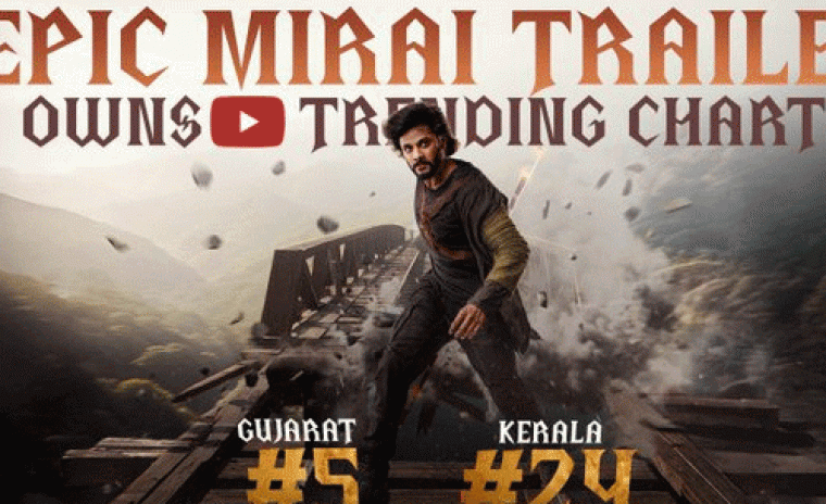 టాలీవుడ్ యంగ్ అండ్ టాలెంటెడ్ హీరో తేజ సజ్జా రాబోయే పాన్-ఇండియా చిత్రం "మిరాయ్" తో మరోసారి ప్రేక్షకులను ఆకర్షించడానికి సిద్ధంగా ఉన్నాడు. ఇటీవలే విడుదలైన ఈ సినిమా గ్లింప్సె మరియు ఫస్ట్ సింగల్ కి భారీ రెస్పాన్స్ లభించింది. ఈ సినిమా యాక్షన్ సినిమా ఔత్సాహికులు మరియు సాధారణ వీక్షకుల ఆసక్తిని రేకెత్తిస్తుంది. ఇటీవలే మూవీ మేకర్స్ ఈ సినిమా యొక్క ట్రైలర్ ని విడుదల చేయగా భారీ స్పందన లభించింది. తాజాగా ఇప్పుడు ఈ సినిమా ట్రైలర్ యూట్యూబ్ లో గ్లోబల్ ఛార్ట్స్ లో ట్రేండింగ్ లో ఉన్నట్లు మూవీ మేకర్స్ ప్రాకటించారు. ఈ విషయాన్ని తెలియజేసేందుకు ప్రొడక్షన్ హౌస్ సోషల్ మీడియాలో సరికొత్త పోస్టర్ ని విడుదల చేసింది. మంచు మనోజ్ ఈ సినిమాలో విలన్ పాత్రలో నటిస్తున్నారు. ఈ సినిమాలో రితిక నాయక్ మహిళా ప్రధాన పాత్రలో నటిస్తుంది. ఈ చిత్రంకి కార్తీక్ ఘట్టమ్నేని సినిమాటోగ్రఫీ మరియు స్క్రీన్ప్లే రెండింటినీ నిర్వహిస్తున్నారు. "మిరాయ్" సెప్టెంబర్ 12, 2025న 8 భాషల్లో గ్రాండ్గా విడుదల కానుంది. ఈ చిత్రం 2D మరియు 3D ఫార్మాట్లలో సినిమాటిక్ అనుభూతిని అందిస్తుంది. ఈ సినిమాకి మణిబాబు కరణం డైలాగ్స్ రాశారు. గౌర హరి సంగీతాన్ని అందించగా, శ్రీ నాగేంద్ర తంగల కళా దర్శకుడిగా వ్యవహరిస్తున్నారు.