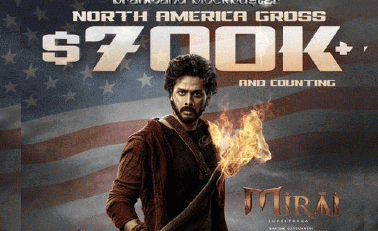 కార్తీక్ ఘట్టమనేని దర్శకత్వంలో టాలీవుడ్ యువ నటుడు తేజా సజ్జా నటించిన 'మిరాయి' చిత్రం సెప్టెంబర్ 12న గ్రాండ్ గా విడుదల అయ్యింది. ఈ సినిమా విడుదలైన అన్ని చోట్ల పాజిటివ్ రివ్యూస్ ని అందుకుంటుంది మరియు సాలిడ్ కలెక్షన్స్ ని రాబడుతుంది. ఈ పాన్-ఇండియా యాక్షన్-అడ్వెంచర్ చిత్రం తేజా సజ్జాని సూపర్ యోధా పాత్రలో చూపిస్తుంది. ఈ సినిమా యొక్క ఓవర్సీస్ రైట్స్ ని శ్లోక ఎంటర్టైన్మెంట్స్ బ్యానర్ సొంతం చేసుకుంది. తాజాగా ఇప్పుడు ఈ సినిమా యొక్క నార్త్ అమెరికా గ్రాస్ $700K మార్క్ కి చేరుకున్నట్లు మేకర్స్ ప్రకటించారు. ఈ విషయాన్ని తెలియజేసేందుకు ప్రొడక్షన్ హౌస్ సోషల్ మీడియాలో స్పెషల్ పోస్టర్ ని విడుదల చేసింది. ఈ చిత్రం త్వరలో వన్ మిలియన్ క్లబ్ లో జాయిన్ అవుతుందని ట్రేడ్ పండిట్స్ అంచనా వేస్తున్నారు. రాకింగ్ స్టార్ మనోజ్ మంచు విలన్ పాత్రలో నటిస్తున్నారు. రితికా నాయక్ ప్రముఖ మహిళ ప్రధాన పాత్రలో నటించారు. ఈ సినిమాలో శ్రియ శరన్, జయ రామ్, జగపతి బాబు కీలక పాత్రలలో నటిస్తున్నారు. ఈ చిత్రం యొక్క సాంకేతిక సిబ్బందిలో సినిమాటోగ్రఫీని నిర్వహించి, స్క్రీన్ ప్లే రాసిన కార్తీక్ ఘట్టమనేని, డైలాగ్స్ రాసిన మణిబాబు కరణితో పాటు స్క్రీన్ ప్లే రాశారు. గోవ్రా హరి సంగీతాన్ని అందిస్తుండగా, శ్రీ నాగేంద్ర తంగాలా ఈ చిత్రానికి ఆర్ట్ డైరెక్టర్. ఈ సినిమని టిజి విశ్వ ప్రసాద్, కృతి ప్రసాద్ పీపుల్ మీడియా ఫ్యాక్టరీ పతాకంపై నిర్మిస్తున్నారు.