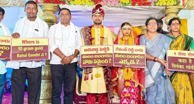 గురువారం ఎకోడా మండలంలోని మోడల్ గ్రామం ముఖ్రా (కె)లో అర్హత కలిగిన వధువులకు 1 తోలా బంగారం అందించే పథకాన్ని అమలు చేయడంలో రాష్ట్ర ప్రభుత్వం జాప్యం చేస్తున్నందుకు వరుడు మరియు వధువు తమ వివాహ వేదికను ఉపయోగించి ప్లకార్డులు ప్రదర్శిస్తూ తమ ఆగ్రహాన్ని వ్యక్తం చేశారు.ముఖ్యమంత్రి ఎ రేవంత్ రెడ్డి మరియు ఎఐసిసి నాయకుడు రాహుల్ గాంధీలను వధువులకు బంగారం ఎప్పుడు ఇస్తారని అడుగుతూ ప్లకార్డులు పట్టుకుని వినూత్న నిరసన తెలిపారు. వారు రేవంత్ రెడ్డి మరియు రాహుల్ గాంధీలను తెలుగు, హిందీ మరియు ఇంగ్లీషు భాషలలో ప్రశ్నించారు. వారి బంధువులు మరియు కుటుంబ సభ్యులు కూడా వారితో చేరారు. బంగారాన్ని మర్చిపోండి, రేవంత్ రెడ్డి సకాలంలో కల్యాణ లక్ష్మి పథకం కింద రూ.1,00,116 ఆర్థిక సహాయం అందించకుండా పేద కుటుంబాన్ని మోసం చేస్తున్నారని ఆ వివాహిత జంట అన్నారు. అర్హులైన వారసులకు బంగారం మరియు సహాయం అందించాలని వారు ప్రభుత్వాన్ని డిమాండ్ చేశారు. మాజీ ముఖ్యమంత్రి కె చంద్రశేఖర్ రావు వధువులకు ఆర్థిక సహాయం అందించడం ద్వారా పేద కుటుంబాలకు మద్దతు ఇస్తున్నారని వారు గుర్తు చేసుకున్నారు.సర్పంచ్ గాడ్గే మీనాక్షి, ఎంపీటీసీ సభ్యుడు సుభాష్, వధూవరుల తల్లిదండ్రులు పాల్గొన్నారు.
