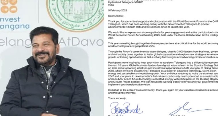 తెలంగాణ CM రేవంత్ రెడ్డికి వరల్డ్ ఎకనామిక్ ఫోరమ్(WEF) లేఖ రాసింది. దావోస్లో జరిగిన WEF సదస్సులో CM పాల్గొని.. రాష్ట్రానికి దాదాపు రూ. 1,80,000 కోట్ల పెట్టుబడులను ఆకర్షించారు. దావోస్ సదస్సులో పాల్గొని క్రియాశీలక భాగస్వామ్యమైనందుకు WEF అధ్యక్షుడు బోర్జ్ బ్రెండె,బ్రెండే, మేనేజింగ్ డైరెక్టర్ మిరెక్ డూసెక్ కృతజ్ఞతలు తెలియజేస్తూ CMకి లేఖ రాశారు. తెలంగాణను ట్రిలియన్ డాలర్ల ఆర్థిక వ్యవస్థగా బలోపేతం చేయాలన్న CM దార్శనికతను వారు ప్రశంసించారు.