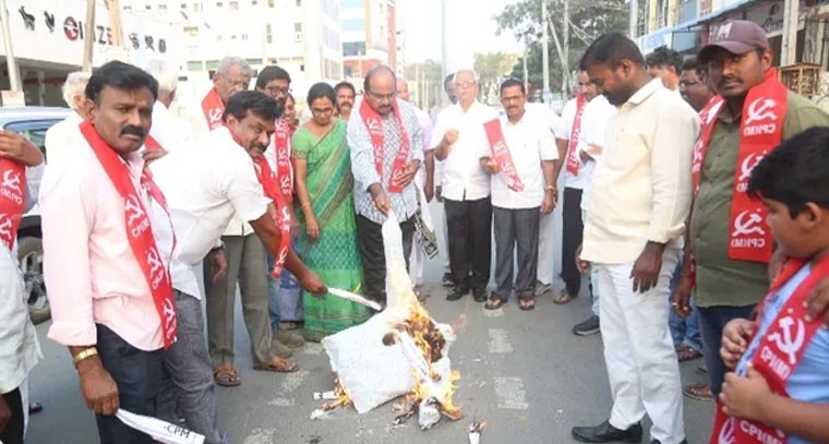 అమెరికా అధ్యక్షుడు ట్రంప్ దేశ సార్వభౌమాధికారాన్ని దెబ్బతీసే ఈ అమెరికా దుర్మార్గపు చర్యలను ప్రతి ఒక్క భారతీయుడు ఖండించాలని సీపీఎం పార్టీ జిల్లా కార్యదర్శి నున్నా నాగేశ్వరరావు అన్నారు. భారతీయ యువకులకు సంకెళ్ళు వేసి నిర్బంధించడాన్ని ఖండిస్తూ సీపీఎం పార్టీ ఖమ్మం డివిజన్ కమిటీ ఆధ్వర్యంలో శుక్రవారం ఎన్ఎస్పి సెంటర్లో అమెరికా అధ్యక్షుడు ట్రంపు, ప్రధాని మోడీ దిష్టిబొమ్మ దగ్ధం చేయడం జరిగింది.