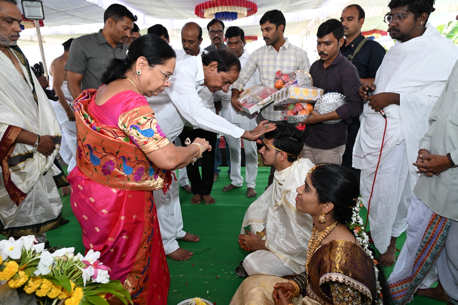 నమస్తే తెలంగాణ ఎడిటర్ తిగుళ్ళ కృష్ణమూర్తి కుమారుని వివాహం సందర్భంగా సోమవారం నాడు ఎర్రవెల్లి సమీపంలోని స్థానిక ఫంక్షన్ హాల్లో జరిగిన సత్యనారాయణ వ్రతం కార్యక్రమానికి బీఆర్ఎస్ అధినేత కేసీఆర్ హాజరయ్యారు. నూతన వధూవరులను కేసీఆర్, శోభమ్మ దంపతులు ఆశీర్వదించారు.సాంప్రదాయ పద్ధతిలో పూలు, పండ్లు అందించి, పట్టువస్త్రాలను బహుకరించారు.కాగా, పురోహితులు కేసీఆర్ దంపతులకు పరస్పరం దండలు మార్పిచ్చి, వారి దాంపత్య జీవితం పదికాలాల పాటు శోభిల్లాలని వేద మంత్రాలతో ఆశీర్వదించారు.కేసీఆర్ గారి పుట్టినరోజును పురస్కరించుకుని, వేద పండితులు "శతమానం భవతి" అంటూ ఆశీర్వచనం అందించారు.ఈ సందర్భంగా తిగుళ్ళ కృష్ణమూర్తి దంపతులు ఇచ్చిన ఆతిథ్యాన్ని కేసీఆర్ దంపతులు స్వీకరించారు. వారి కుటుంబ సభ్యుల విన్నపం మేరకు వారితో కలిసి ఫోటోలు దిగారు. తమ ఆహ్వానం మేరకు కార్యక్రమానికి హాజరైన కేసీఆర్కు తిగుళ్ళ దంపతులు ధన్యవాదాలు తెలిపారు.ఈ కార్యక్రమంలో మాజీ మంత్రి, ఎమ్మెల్యే వేముల ప్రశాంత్ రెడ్డి , మాజీ ఎమ్మెల్యే జీవన్ రెడ్డి , వంటేరు ప్రతాప్ రెడ్డి, పార్టీ నాయకులు వంశిధర్ రావు, తదితర స్థానిక నేతలు, సీఎం మాజీ సీపీఆర్వో వనం జ్వాలా నరసింహారావు, సీనియర్ జర్నలిస్టు రామచంద్ర మూర్తి, మల్లేపల్లి లక్ష్మయ్య తదితరులు పాల్గొన్నారు.