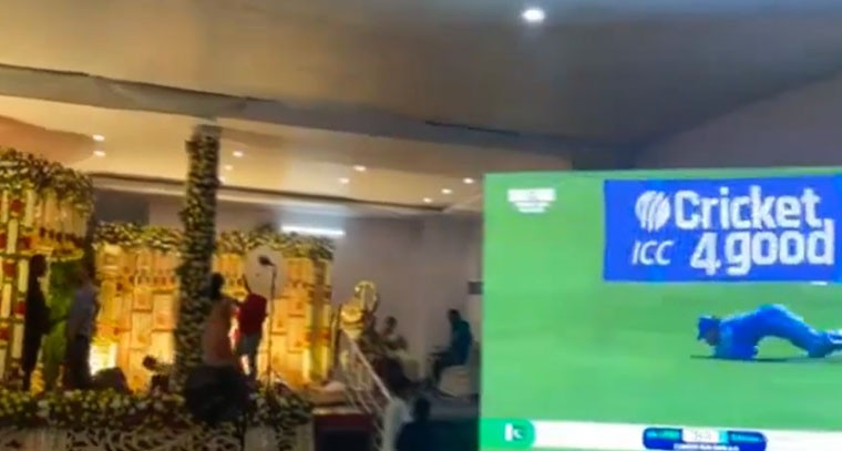 ఛాంపియన్స్ ట్రోఫీలో భాగంగా భారత్-పాక్ జట్లు ఆదివారం తలపడుతున్నాయి. దాయాదుల పోరు అంటే రెండు దేశాల్లోనే కాకుండా ప్రపంచ వ్యాప్తంగా విపరీతమైన క్రేజ్ ఉంటుందన్న సంగతి తెలిసిందే. ఈ నేపథ్యంలో హైదరాబాద్లో జరుగుతున్న ఓ వివాహ వేడుకలో అతిథుల కోసం భారత్-పాక్ మ్యాచ్ లైవ్ను ఏర్పాటు చేశారు. ఓ వైపు పెళ్లి, మరో వైపు మ్యాచ్ను అతిథులు ఆస్వాదిస్తున్నారు. ఇక ఈ హై వోల్టేజీ మ్యాచ్ చూసేందుకు అంతా టీవీలకు అతుక్కుపోయారు.