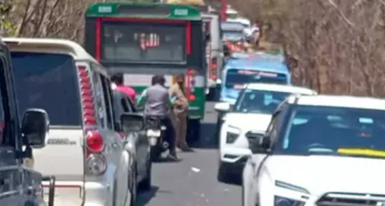 శ్రీశైలం నుంచి దోర్నాల వైపు వెళ్లే నల్లమల ఘాట్ రోడ్లో భారీగా ట్రాఫిక్ స్తంభించింది. శుక్రవారం మ.12 గంటల నుంచి వాహనాల రాకపోకలు నిలిచిపోయాయి. ఇసుక లోడ్తో వెళ్తున్న లారీ రహదారి పైనే నిలిచిపోయింది. దీంతో తుమ్మల బైలుకు ఐదు కిలోమీటర్ల దూరంలో ఉన్న మలుపు వద్దనుంచి ఇరువైపులా వచ్చి పోయే వాహనాలన్నీ ఆగిపోయాయి. దాదాపు గంటకు పైగా ట్రాఫిక్ జామ్ కావడంతో వాహనదారులు, ప్రయాణికులు తీవ్ర ఇబ్బందులు పడ్డారు.
