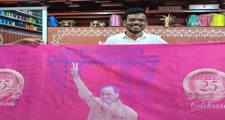 బీఆర్ఎస్ రజతోత్సవ సభకు కేసీఆర్ కోసం వెండి పట్టు పోగులతో ప్రత్యేకమైన శాలువా నేసిన సిరిసిల్ల నేతన్న హరిప్రసాద్.పట్టణ బీఆర్ఎస్ పార్టీ అధ్యక్షుడు జిందం చక్రపాణి ఆర్డర్ మేరకు చేనేత కార్మికుడు వెళ్లి హరిప్రసాద్ దాదాపు 5 రోజుల పాటు శ్రమించి వెండి పట్టు దారాలతో కేసీఆర్ ముఖచిత్రం వరంగల్ కాకతీయ కామన్ మరియు సిల్వర్ జూబ్లీ లోగో రెండు వైపుల వచ్చే విధంగా రెండు 32 గ్రాముల వెండి మరియు పట్టు దారంతో రెండున్నర మీటర్ల పొడవు 46 ఇంచుల వెడల్పుతో శాలువాను రూపొందించాడు.ఈ ప్రత్యేకమైన శాలువాను ఈరోజు వరంగల్ సభలో కేసీఆర్ గారికి జిందం చక్రపాణి గారు అందించనున్నారు.