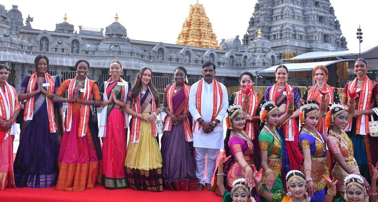 యాదాద్రి భువనగిరి జిల్లా తెలంగాణ ప్రముఖ పుణ్యక్షేత్రం యాదగిరిగుట్టను గురువారం రోజు ప్రపంచ సుందరీమణులు సందర్శించారు.ఈ సందర్భంగా ప్రభుత్వ విప్,ఆలేరు ఎమ్మెల్యే శ్రీ బీర్ల అయిలయ్య గారు కుటుంబ సమేతంగా సుందరీమణులకు స్వాగతం పలికారు.అనంతరం ఆలయ విశిష్టతను LED స్క్రిన్ లో చూసారు.ఆలయ విశిష్టతను ఎమ్మెల్యే బీర్ల అయిలయ్య గారు సుందరీమణులకు తెలిపి స్వాగతం పలికినట్లు తెలిపారు.ఆ తర్వాత బ్యాటరీ వాహనాలలో మాడవీధులకు చేరుకొని అఖండ దీపానికి నెయ్యిని సమర్పించారు.అనంతరం కోలాటాలు,నృత్యాల మధ్య ఆలయంలో చేరుకున్నారు.ఆలయంలో శ్రీ లక్ష్మీ నరసింహ స్వామి వారిని దర్శించుకొని ప్రత్యేక పూజలు నిర్వహించారు.అనంతరం ఆలయ అర్చకులు ప్రత్యేక ఆశీర్వచనం చేయగా,ఆలయ అధికారులు లడ్డు ప్రసాదాన్ని,స్వామివారి చిత్రపటాన్ని అందజేశారు.అనంతరం మాడవీధులలో శిల్పకట్టడాల వద్ద సుందరీమణులు ప్రత్యేక ఫోటోలను తీసుకున్నారు.