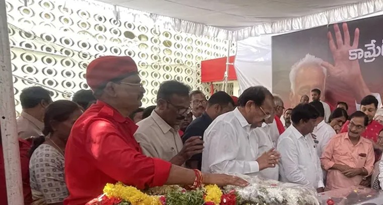సురవరం లేనిసీపీఐ జాతీయ మాజీ ప్రధాన కార్యదర్శి, మాజీ ఎంపీ సురవరం సుధాకర్రెడ్డి పార్థివ దేహానికి మాజీ ఉప రాష్ట్రపతి వెంకయ్య నాయుడు ఆదివారం నివాళులు అర్పించారు. హైదరాబాద్లోని మఖ్దూం భవన్కు ఆయన వెళ్లారు. సురవరం సుధాకర్రెడ్డి కుటుంబ సభ్యులను ఆయన పరామర్శించారు. ఈ సందర్భంగా ప్రజల కోసం సురవరం సుధాకర్రెడ్డి చేసిన సేవలను వెంకయ్యనాయుడు గుర్తుచేసుకున్నారు. ఆయనలేని లోటు పూడ్చలేనిదని అన్నారు. నమ్మిన సిద్ధాంతం కోసం నిలబడిన వ్యక్తి సురవరం