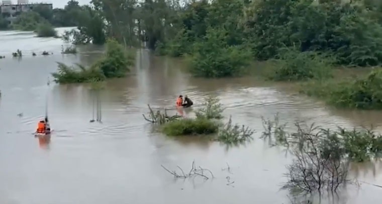 నిర్మల్ జిల్లాలోని బాసరలో కుండపోత వర్షాలు కురుస్తున్నాయి. దీంతో వరదల్లో 8 కుటుంబాలు చిక్కుకున్నాయి. బాసరలోని మూడు లాడ్జీల్లో వాళ్లు ఉన్నారని తెలుసుకున్న రెస్క్యూ టీమ్ రంగంలోకి దిగింది. లాడ్జీల్లో నుంచి సురక్షిత ప్రాంతాలకు బాధిత కుటుంబాల్ని తరలించింది. ఈ సహాయక చర్యల్లో SDRF సెకండ్ బెటాలిటన్ యాపల్ గూడ సిబ్బంది పాల్గొన్నారు. తమను కాపాడినందుకు పోలీసు, రెస్క్యూ సిబ్బందికి బాధితులు ధన్యవాదాలు తెలిపారు.