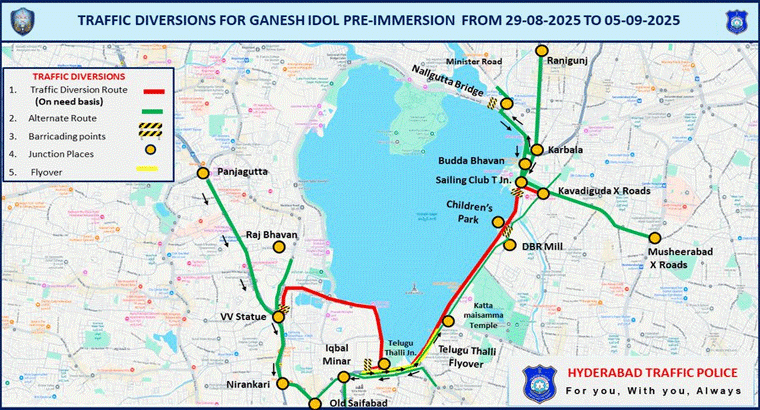 సెయిలింగ్ క్లబ్ జంక్షన్, తెలుగు తల్లి ఫ్లైఓవర్, కవాడిగూడ ఎక్స్ రోడ్, డీబీఆర్ మిల్స్, నల్లగుట్ట బ్రిడ్జి, బుద్ధ భవన్, వీవీ విగ్రహం ప్రాంతాల్లో ట్రాఫిక్ మళ్లింపులు ఉంటాయి. అత్యవసర పరిస్థితులు తప్ప మిగతా సమయాల్లో వాహనదారులు లిబర్టీ, ఖైరతాబాద్, పంజాగుట్ట, సికింద్రాబాద్ వంటి ప్రాంతాలకు వెళ్లేటప్పుడు ప్రత్యామ్నాయ రూట్లు ఎంచుకోవాలని అధికారులు సూచించారు. అదనంగా, బేగంపేట్, మినిస్టర్ రోడ్, కవాడిగూడ వైపు వచ్చే వాహనాలు ప్రత్యేక మార్గాల ద్వారా మళ్లించనున్నారు.