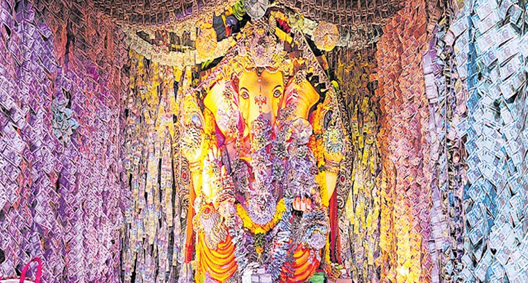 నందిగామ పట్టణంలోని వాసవి మార్కెట్లో ప్రతిష్టించిన గణపతి విగ్రహం భక్తులను ప్రత్యేకంగా ఆకర్షిస్తోంది. ఇక్కడ వినాయకుడిని రూ.3.10 కోట్ల విలువైన కరెన్సీ నోట్లతో అద్భుతంగా అలంకరించారు.వాసవి మార్కెట్ గణపతి కమిటీ 43వ వార్షికోత్సవాలను పురస్కరించుకుని ఈ వినూత్న అలంకరణను చేపట్టింది. మండపం, విగ్రహాన్ని వివిధ నోట్లు ఉపయోగించి శోభాయమానంగా తీర్చిదిద్దడంతో భక్తులు, సందర్శకులు గణపతిని దర్శించేందుకు భారీగా తరలివస్తున్నారు. కరెన్సీ నోట్లతో అలంకరించిన గణపతిని చూసి భక్తులు ప్రత్యేక పూజలు నిర్వహించి తీర్థప్రసాదాలు స్వీకరిస్తున్నారు.ప్రతి సంవత్సరం వినాయక చవితి సందర్భంగా ఏదో ఒక ప్రత్యేకతతో మండపం ఏర్పాటు చేయడం తమ సంప్రదాయమని కమిటీ సభ్యులు తెలిపారు. ఈసారి కరెన్సీ నోట్ల అలంకరణతో ఆ సంప్రదాయాన్ని కొనసాగించినట్టు వారు చెప్పారు. అంతేకాకుండా, ఉపయోగించిన నోట్ల భద్రత కోసం అన్ని జాగ్రత్తలు తీసుకున్నామని స్పష్టం చేశారు. ఈ ప్రత్యేక గణపతి దర్శనం కోసం పరిసర ప్రాంతాల నుండి కూడా భక్తులు తరలివస్తున్నారు.