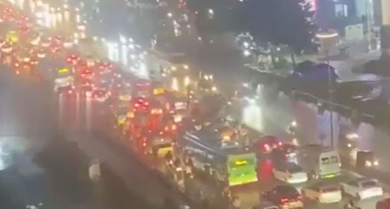 మియాపూర్ - మదీనాగూడ రహదారి వద్ద కురుస్తున్న వర్షం, అధిక ట్రాఫిక్ కారణంగా భారీగా ట్రాఫిక్ జామ్ ఏర్పడింది. దీనితో వాహనదారులు, ప్రయాణికులు తీవ్ర ఇబ్బందులు ఎదుర్కొంటున్నారు. కిలోమీటర్ల మేర వాహనాలు నిలిచిపోవడంతో గంటల తరబడి వేచి ఉండాల్సి వస్తోంది. ట్రాఫిక్ పోలీసులు పరిస్థితిని చక్కదిద్దేందుకు ప్రయత్నిస్తున్నప్పటికీ, వర్షం కారణంగా ఇబ్బందులు కొనసాగుతున్నాయి.