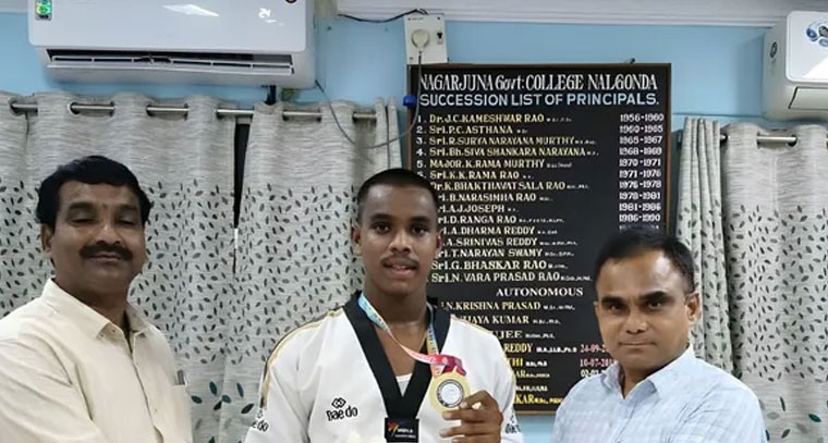 నాగార్జున ప్రభుత్వ కళాశాల బీఎస్సీ ఎంపీసీఎస్ ప్రథమ సంవత్సరం విద్యార్థి ఎన్ మనోజ్, తెలంగాణ స్టేట్ టైక్వాండో అసోసియేషన్ రాష్ట్రస్థాయి పోటీలలో అండర్ 73 కేజీ విభాగంలో గోల్డ్ మెడల్ గెలుచుకున్నాడు. ఈ విజయం ద్వారా అతను జార్ఖండ్ రాష్ట్రంలోని రాంచీలో జరగనున్న జాతీయస్థాయి టైక్వాండో పోటీలలో పాల్గొనేందుకు అర్హత సాధించాడు. ఈ సందర్భంగా కళాశాల ప్రిన్సిపల్ డాక్టర్ సముద్రాల ఉపేందర్, అధ్యాపకులు, విద్యార్థులు మనోజ్ను అభినందించారు.