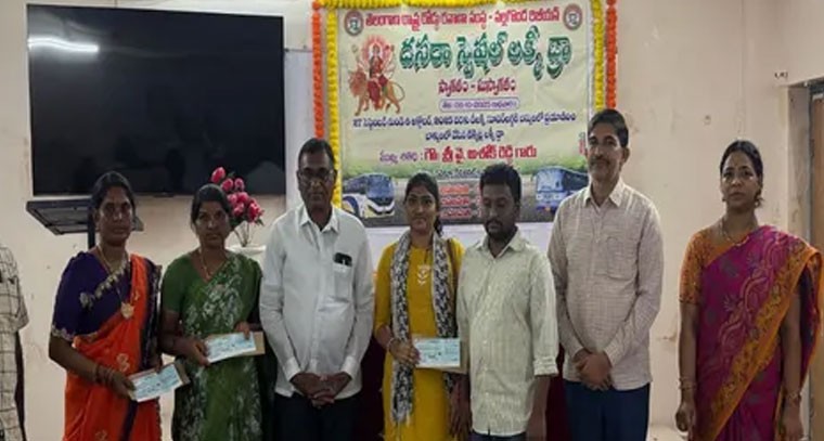 నల్లగొండ డిపోలో శనివారం ఆర్టీసీ దసరా స్పెషల్ లక్కీ డ్రా విజేతలకు బహుమతులు ప్రధానం చేశారు. ఆర్డీఓ వై. అశోక్రెడ్డి విజేతలకు నగదు చెక్లను అందజేశారు. సెప్టెంబర్ 27 నుంచి అక్టోబర్ 6వ తేదీ వరకు డీలక్స్, సూపర్లగ్జరీ బస్సుల్లో ప్రయాణించి డ్రా బాక్స్లో వేసిన టికెట్ల నుండి ముగ్గురిని ఎంపిక చేశారు. మొదటి బహుమతిగా వై. రాము (రూ. 25 వేలు), రెండవ బహుమతిగా అనసూర్య (రూ. 15 వేలు), మూడవ బహుమతిగా తోటపల్లి బాలమణి (రూ. 10 వేలు) గెలుచుకున్నారు.