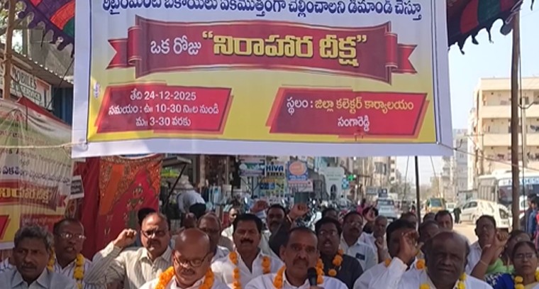 సంగారెడ్డి జిల్లా కేంద్రంలోని కలెక్టర్ కార్యాలయం ఎదుట తెలంగాణ ప్రభుత్వ పెన్షన్ దారులు బుధవారం భారీ ఎత్తున నిరాహార దీక్ష చేపట్టారు. తమకు రావాల్సిన రిటైర్మెంట్ బకాయిలను విడతల వారీగా కాకుండా, ఏకకాలంలో మొత్తం చెల్లించాలని వారు ప్రభుత్వాన్ని డిమాండ్ చేశారు. వృద్ధాప్యంలో తాము ఆర్థికంగా ఇబ్బందులు పడుతున్నామని, ప్రభుత్వం వెంటనే స్పందించి తమ న్యాయమైన కోర్కెలను తీర్చాలని కోరారు. ఈ దీక్షలో పెన్షన్ దారుల సంఘం నాయకులు మరియు అనేక మంది సభ్యులు పాల్గొని తమ నిరసనను వ్యక్తం చేశారు.