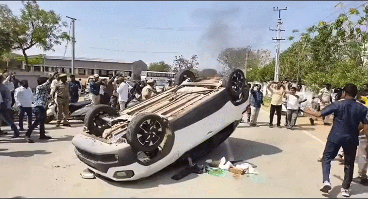 ప్రభుత్వ డిగ్రీ కాలేజీ భూములు, అరోరా కాలేజీ భూములు, శిశు మందిర్ పాఠశాల విషయంలో కాంగ్రెస్, బీజేపీ నేతలు సవాళ్లు, ప్రతిసవాళ్లు విసురుకున్న క్రమంలో కామారెడ్డిలో హైటెన్షన్ వాతావరణం నడుస్తోంది. ఈ క్రమంలో దమ్ముంటే చర్చకు రావాలంటూ కాంగ్రెస్ నాయకులకు ఎమ్మెల్యే వెంకటరమణారెడ్డి సవాల్ విసిరారు. ఇవాళ ఉదయం శిశుమందిర్ వద్దకు చర్చకు రావాలని షబ్బీర్ అలీని ఛాలెంజ్ చేశారు. దీంతో కాంగ్రెస్ నేతలు శనివారం ఉదయం ఎమ్మెల్యే వెంకటరమణారెడ్డి క్యాంపు ఆఫీసు దగ్గరికి చేరుకున్నారు. ఎమ్మెల్యేకి వ్యతిరేకంగా నినాదాలు చేశారు. ఈ క్రమంలో బీజేపీ, కాంగ్రెస్ నేతల మధ్య వాగ్వాదం చోటు చేసుకుంది. కాంగ్రెస్ నేత మహేందర్ రెడ్డి కారును బీజేపీ కార్యకర్తలు ధ్వంసం చేశారు. కారు అద్దాలు ధ్వసం చేయటంతో పాటు రోడ్డుపైనే పల్టీలు కొట్టించారు. అనంతరం కారుకు నిప్పు పెట్టారు. పోలీసులు అడ్డుకునే ప్రయత్నం చేసినా వినలేదు. అప్రమత్తమైన పోలీసులు మంటల్ని ఆర్పేశారు.