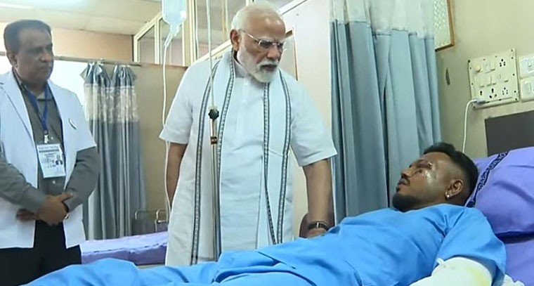 విమాన ప్రమాదంలో గాయపడి అహ్మదాబాద్ సివిల్ ఆసుపత్రిలో చికిత్స పొందుతున్న బాధితులను ఇవాళ ప్రధాని నరేంద్ర మోదీ పరామర్శించారు. విమానంలో మొత్తం 242 మంది ఉండగా భారత సంతతికి చెందిన విశ్వాస్ కుమార్ రమేష్ ఒక్కరే క్షేమంగా బయటపడ్డారు. దీంతో ఆస్పత్రిలో చికిత్స పొందుతున్న రమేష్ ను ప్రధాని మోదీ పరామర్శించి, ప్రమాద తీరును అడిగి తెలుసుకున్నారు.అహ్మదాబాద్ నుంచి లండన్కు బయలుదేరిన ఎయిరిండియా విమానం గురువారం ఘోర ప్రమాదానికి గురైన విషయం తెలిసిందే. ఈ విమాన ప్రమాదంలో ప్రయాణికులు, సిబ్బంది కూడా దుర్మరణం పాలయ్యారు. కాగా వైద్య కళాశాల భవనంపై విమానం పడిపోవడంతో అందులో కొంతమంది ప్రాణాలు కోల్పోయారు. మరికొంతమంది తీవ్రంగా గాయపడ్డారు. వారు సివిల్ ఆస్పత్రిలో చికిత్స పొందుతున్నారు. విమాన ప్రమాదంలో ధ్వంసమైన మెడికల్ కాలేజ్ భవనాన్ని ప్రధాని మోదీ పరిశీలించారు. అయితే విమానం ప్రమాదంలో ఒకే ఒక వ్యక్తి రమేష్ విశ్వాస్ కుమార్ ప్రాణాలతో బయటపడ్డారు. అతను మృత్యుంజయుడుగా నిలిచారు. విమానం నేల కూలిన వెంటనే బయటకు వచ్చిన రమేష్ ప్రాణభయంతో ఘటనా స్థలం నుంచి దూరంగా వెళుతుండగా చుట్టుపక్కలవాళ్లు వీడియో తీశారు.