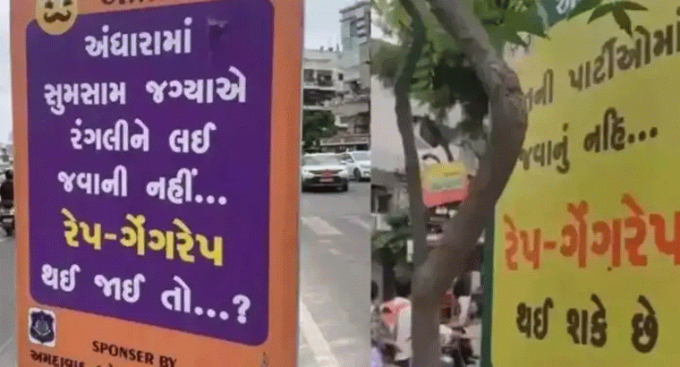 మహిళల భద్రతకు సంబంధించిన ఒక వివాదాస్పద పోస్టర్ ప్రస్తుతం గుజరాత్ రాష్ట్రంలో తీవ్ర దుమారాన్ని రేపింది. 'లేట్ నైట్ పార్టీలకు వెళ్లడం వల్ల అత్యాచారం లేదా గ్యాంగ్ రేప్కు గురయ్యే అవకాశం ఉంది' అంటూ అహ్మదాబాద్ నగరంలో కొన్ని పోస్టర్లు దర్శనం ఇచ్చాయి. ఈ పోస్టర్ల వెనుక అహ్మదాబాద్ నగర ట్రాఫిక్ పోలీసులు ఉన్నారని వార్తలు రావడంతో ప్రతిపక్షాలు, మహిళా సంఘాలు తీవ్ర ఆగ్రహం వ్యక్తం చేస్తున్నాయి. దీంతో వివాదాస్పద పోస్టర్లను అధికారులు హుటాహుటిన తొలగించారు.