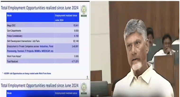 ఆంధ్రప్రదేశ్లో ఎన్డీఏ కూటమి సర్కారు అధికారంలోకి వచ్చిన అనంతరం యువతకు పెద్దఎత్తున ఉద్యోగాలు కల్పించే ప్రయత్నాలు చేస్తున్నట్లు సీఎం నారా చంద్రబాబు నాయుడు వెల్లడించారు. తాము అధికారంలోకి వచ్చిన అనంతరం ఎంతమందికి ఉద్యోగాలు కల్పించామనే వివరాలను అసెంబ్లీ వేదికగా సీఎం చంద్రబాబు వివరించారు. గత 15 నెలల్లో అన్ని రంగాల్లోనూ, అన్ని సెక్టార్లలోనూ కలిపి మొత్తం 4,71,574 మందికి ఉద్యోగాలు కల్పించామని చంద్రబాబు అసెంబ్లీ వేదికగా ప్రకటించారు. ఇప్పటి వరకూ మెగా డీఎస్సీ ద్వారా 15941 ఉద్యోగాలు, వివిధ ప్రభుత్వ విభాగాల్లో 9093 ఉద్యోగాలు, పోలీస్ శాఖలో 6100 ఉద్యోగాలు, స్కిల్ డెవలప్మెంట్ - జాబ్ మేళాల ద్వారా 92,149 ఉద్యోగాలు, వర్క్ ఫ్రం హోం ద్వారా 5500 ఉద్యోగాలు, ప్రైవేట్ రంగంలో మొత్తంగా 3,48,891 ఉద్యోగాలు కల్పించినట్లు చంద్రబాబు వివరించారు. ఎవరు, ఎక్కడ, ఎప్పుడు ఏ ఉద్యోగం పొందారు, ఏ జాబ్ చేస్తున్నారనే వివరాలను పోర్టల్ ద్వారా కూడా వెల్లడిస్తామని చంద్రబాబు ప్రకటించారు.