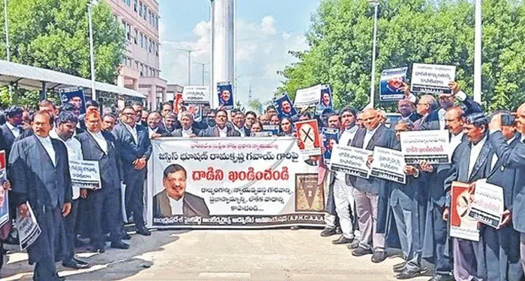 సుప్రీంకోర్టు ప్రధాన న్యాయమూర్తి జస్టిస్ బీఆర్ గవాయ్పై జరిగిన దాడి యత్నాన్ని నిరసిస్తూ ఆంధ్రప్రదేశ్ హైకోర్టు వద్ద న్యాయవాదులు మంగళవారం నిరసన తెలిపారు. హైకోర్టు న్యాయవాదుల సంఘం, ఏపీ హైకోర్టు అంబేడ్కరైట్స్ అడ్వొకేట్ అసోసియేషన్ ఆధ్వర్యంలో జరిగిన ఈ కార్యక్రమంలో సీజేఐపై దాడి యత్నాన్ని ఖండించారు. భారత రాజ్యాంగాన్ని, ప్రజాస్వామ్యాన్ని కాపాడుకుందామని నినదించారు. సీనియర్ న్యాయవాదులు పోసాని వెంకటేశ్వర్లు, కె.చిదంబరం తదితరులు మాట్లాడుతూ, సీజేఐపై దాడి యత్నాన్ని హేయమైన చర్యగా అభివర్ణించారు. దాడికి ప్రయత్నించిన న్యాయవాదిని కఠినంగా శిక్షించాలని, సనాతన ధర్మం పేరుతో చేసే దాడులను క్షమించరాదని కోరారు.