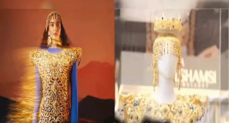 ఇక స్టేట్మెంట్ నెక్లెస్ అంటే ప్రధాన హారం 8.810 కిలోలతో రూపొందించారు. 134.1 గ్రాముల గోల్డ్తో చెవిపోగులు తయారు చేశారు. హియార్ అంటే నడుము ఆభరణం 738.5 గ్రాముల బంగారంతో తీర్చిదిద్దారు. ఈ అద్భుతమైన బంగారు డ్రెస్ కళాఖండాన్ని షార్జాలో జరిగిన 56వ మిడిల్ ఈస్ట్ వాచ్ అండ్ జ్యువెలరీ షోలో ప్రపంచానికి పరిచయం చేశారు.