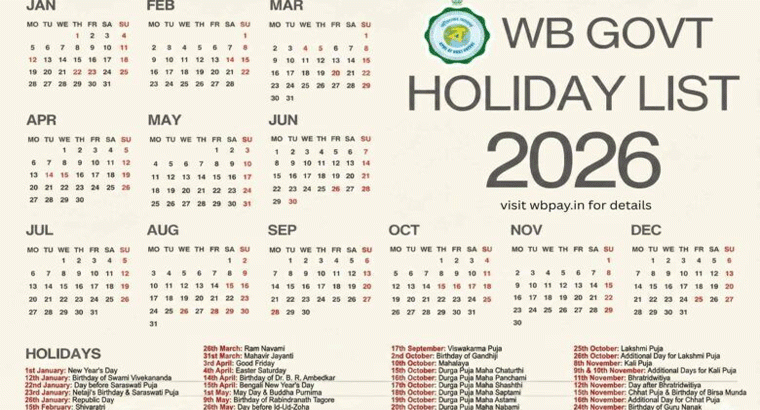 ప్రభుత్వ ఉద్యోగులకు సర్కారు శుభవార్త చెప్పింది. వచ్చే ఏడాదికి సంబంధించిన సెలవుల జాబితాను పశ్చిమ్ బెంగాల్ ప్రభుత్వం విడుదల చేసింది. బెంగాల్ సర్కారు విడుదల చేసిన సెలవుల క్యాలెండర్‌ 2026లో ఆదివారాలు, రెండో శనివారం, ఆప్షనల్ హాలీడేస్‌తో కలిపితే మొత్తం సెలవులు 150 రోజులకుపైనే ఉన్నాయి. వివిధ పండగలు, స్వాతంత్య్ర దినోత్సవం, రిపబ్లిక్ డే, జాతీయ నాయకులు, మహాత్ముల పుట్టినరోజులు సహా ప్రభుత్వం అధికారికంగా ప్రకటించిన సెలవులు 47. ఇందులో నెలల వారీగా చూస్తే జనవరిలో ఐదు, ఫిబ్రవరిలో రెండు, మార్చిలో ఏడు, ఏప్రిల్‌లో మూడు, మేలో నాలుగు, జూన్, జులైలో ఒక్కొక్కటి, ఆగస్టులో మూడు, సెప్టెంబరులో రెండు, అక్టోబరులో 12, నవంబరులో ఆరు, డిసెంబరులో ఒకటి ఉన్నాయి.