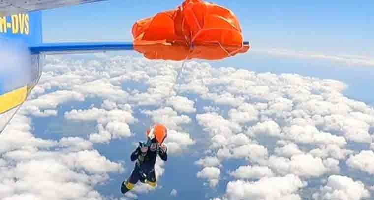 స్కైడైవింగ్ కోసం విమానంలో పైకి వెళ్లిన ఓ వ్యక్తి కొద్దిసేపు గాల్లోనే వేలాడాడు. స్కైడైవింగ్ చేస్తుండగా ఆయన పారాచూట్ విమానం తోకకు చుట్టుకోవడంతో ఈ అనూహ్య ఘటన చోటుచేసుకుంది. ఆస్ట్రేలియాలోని సౌత్ ఆఫ్ కెయిర్న్స్ లో గత నెలలో ఈ ఘటన చోటుచేసుకుంది. తాజాగా దీనికి సంబంధించిన వీడియో వెలుగులోకి వచ్చింది. వివరాల్లోకి వెళితే.. కొంతమంది ఔత్సాహిక స్కైడైవర్లు ఓ విమానంలో ఆకాశంలోకి వెళ్లి దాదాపు 15 వేల అడుగుల ఎత్తులో నుంచి కిందకి దూకుతున్నారు. ఈ క్రమంలో ఓ స్కైడైవర్ తొందరపడి పారాచూట్ బటన్ ను ముందే నొక్కాడు. దీంతో అతను విమానం అంచున ఉండగానే పారాచూట్ విచ్చుకుంది. గాలి వేగానికి అది విమానం తోకను చుట్టేసుకుంది. ఇంతలోనే ఆ స్కైడైవర్ విమానంలో నుంచి దూకేశాడు.పారాచూట్ విమానం తోకకు చుట్టుకోవడంతో ఆ స్కైడైవర్ గాల్లో వేలాడాడు. దీంతో తీవ్ర భయాందోళనలకు గురైనప్పటికీ వెంటనే సమయస్ఫూర్తితో తన వద్ద ఉన్న కత్తితో పారాచూట్ తాళ్లను కోసి విమానం నుంచి విడివడ్డాడు. స్కైడైవర్ల పారాచూట్ లలో అదనంగా ఉండే రిజర్వ్ పారాచూట్ సాయంతో క్షేమంగా నేలపై దిగాడు. ఈ ఘటనకు సంబంధించిన వీడియో ప్రస్తుతం వైరల్ అవుతోంది. పారాచూట్ కారణంగా విమానం కూడా పాక్షికంగా దెబ్బతిన్నప్పటికీ పైలట్ సురక్షితంగా ల్యాండ్ చేసినట్లు అధికారులు తెలిపారు.