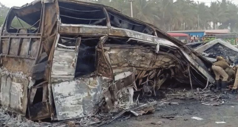 కర్ణాటకలోని చిత్రదుర్గ జిల్లాలో జరిగిన ఘోర రోడ్డు ప్రమాదం నుంచి 42 మంది చిన్నారులు త్రుటిలో తప్పించుకున్నారు. దండేలికి చెందిన విద్యార్థుల టూర్ బస్సు ప్రమాదానికి గురైన బస్సుకు సమాంతరంగా ప్రయాణిస్తూ, లారీ ఢీకొన్న బస్సును దాటుకొని సురక్షితంగా ముందుకు వెళ్లింది. గురువారం తెల్లవారుజామున చిత్రదుర్గలో బెంగళూరు నుంచి గోకర్ణ వెళ్తున్న ప్రైవేట్ ట్రావెల్స్ బస్సును కంటెయినర్ లారీ ఢీకొనడంతో బస్సులో మంటలు చెలరేగి 20 మంది ప్రయాణికులు సజీవ దహనమయ్యారు.