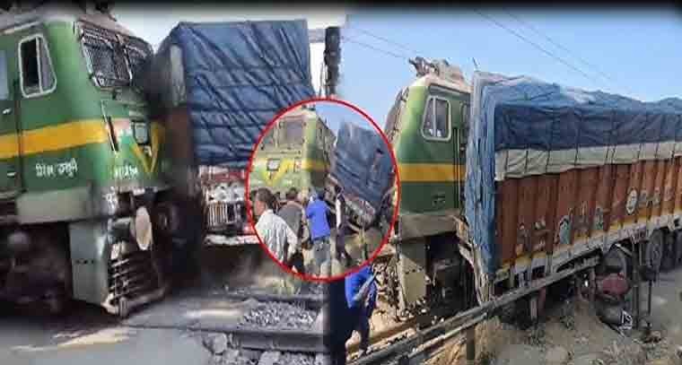 ఝార్ఖండ్‌లో ఓ రైల్వే గేట్ వద్ద ఒళ్లు గగుర్పొడిచే ప్రమాదం చోటు చేసుకుంది. గేట్ వేయకపోవడంతోనే ఈ ప్రమాదం జరిగింది. అదృష్టవశాత్తూ ఎటువంటి ప్రాణనష్టమూ సంభవించలేదు. ఆ యాక్సిడెంట్‌కు సంబంధించిన వీడియో సోషల్ మీడియాలో విపరీతంగా వైరల్ అవుతోంది.ఝార్ఖండ్‌లోని దేవ్‌ఘర్ జిల్లాలోని నవాదిహ్ రైల్వే క్రాసింగ్ వద్ద ట్రాఫిక్ జామ్ కారణంగా ఓ భారీ ట్రక్కు.. రైలు పట్టాలపై నిలిచిపోయింది. అదే సమయంలో ఆ ట్రాక్ గుండా గోండా-అసన్‌సోల్ ఎక్స్‌ప్రెస్ రైలు వచ్చింది. ముందు భారీగా వాహనాలు నిలిచిపోవడంతో ట్రక్కు ముందుకు వెళ్లలేక ట్రాక్ పైనే నిలిచిపోయింది. దీంతో ఆ రైలు, ట్రక్కు వెనుక భాగాన్ని ఢీకొట్టింది. లోకో పైలెట్ త్వరగా స్పందించి రైలు వేగాన్ని తగ్గించారు. దీంతో ట్రక్కును ఢీకొట్టిన రైలు అక్కడే ఆగిపోయింది.ఈ ప్రమాదంలో ట్రక్కు పూర్తిగా దెబ్బతింది. రైలు ఇంజిన్ పాక్షికంగా దెబ్బతింది. ఈ ఘటనలో ఎటువంటి ప్రాణ నష్టమూ సంభవించలేదు. ఈ ప్రమాదం కారణంగా జసిడిహ్-అసన్‌సోల్ మార్గంలో రైలు రాకపోకలు రెండు గంటల పాటు నిలిచిపోయాయి. ఈ ఘటనపై నలుగురు సభ్యుల కమిటీ విచారణ చేయబోతున్నట్టు అసన్‌సోల్ రైల్వే డివిజన్ అధికారి తెలిపారు.