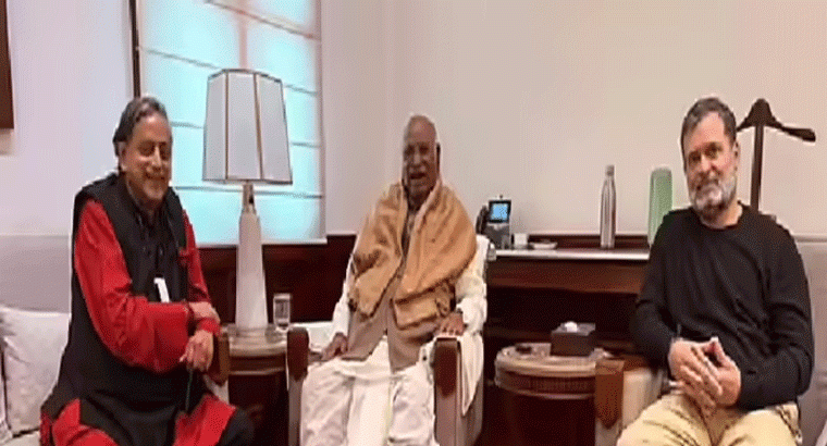 కాంగ్రెస్ పార్టీలో తన స్థానంపై నెలకొన్న అనిశ్చితి నేపథ్యంలో సీనియర్ నాయకుడు శశి థరూర్.. పార్టీ జాతీయ అధ్యక్షుడు మల్లికార్జున్ ఖర్గే, అగ్రనేత రాహుల్ గాంధీలతో భేటీ అయ్యారు. గురువారం ఉదయం పార్లమెంట్ హౌస్‌లో జరిగిన ఈ సమావేశం 90 నిమిషాల పాటు సాగింది. ప్రధాన మంత్రి నరేంద్ర మోదీని ప్రశంసిస్తూ థరూర్ చేసిన వ్యాఖ్యలు.. బీజేపీలో చేరతారనే ఊహాగానాల నేపథ్యంలో ఈ కలయిక ప్రాధాన్యతను సంతరించుకుంది. ఖర్గే, రాహుల్‌తో సమావేశం ముగిసిన తర్వాత థరూర్ మీడియాతో మాట్లాడుతూ.. ‘మేము చాలా మంచి, నిర్మాణాత్మకమైన, సానుకూలమైన చర్చ జరిపాం.. అంతా బాగానే ఉంది, మేము ఒకే తాటిపై ముందుకు వెళ్తున్నాం...’ అని తెలిపారు.