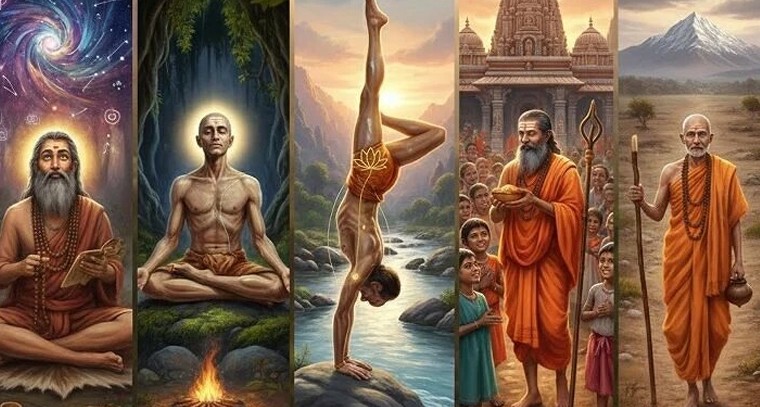 చివరగా, సంపూర్ణ వైరాగ్యంతో సర్వస్వాన్ని త్యజించిన వారే 'సన్యాసులు'. వీరు ఇల్లు, వాకిలి, బంధుత్వాలను వదిలివేసి, కేవలం మోక్ష సాధనే లక్ష్యంగా జీవిస్తారు. భిక్షాటన చేస్తూ, లభించిన దానితో తృప్తి చెందుతూ నిరంతరం ఆత్మజ్ఞానం కోసం తపిస్తుంటారు. జనన మరణ చక్రం నుండి విముక్తి పొందడమే వీరి అంతిమ ధ్యేయం. ఇలా భిన్న మార్గాలలో సాగే ఈ సాధకులందరూ భారతీయ ఆధ్యాత్మిక వారసత్వానికి మూలస్తంభాలుగా నిలుస్తున్నారు.