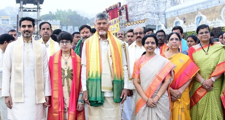 సీఎం చంద్రబాబు, మంత్రి లోకేశ్ కుటుంబ సమేతంగా తిరుమల శ్రీవారిని దర్శించుకున్నారు. దేవాన్ష్ పుట్టినరోజు సందర్భంగా శుక్రవారమే కొండపైకి చేరుకున్న సీఎం, ఇవాళ ఉదయం వేంకటేశ్వర స్వామిని దర్శించుకున్నారు. ముందుగా సీఎం కుటుంబ సభ్యులకు టీటీడీ ఈవో రవిచంద్ర, అర్చకులు ఆలయ మర్యాదలతో స్వాగతం పలికారు. సీఎంతో పాటు పలువురు మంత్రులు, ఎమ్మెల్యేలు, నాయకులు కూడా శ్రీవారి సేవలో పాల్గొన్నారు.ముఖ్యమంత్రి చంద్రబాబు నాయుడు కుటుంబం తిరుమల శ్రీవారిని దర్శించుకుంది.ఈ సందర్భంగా తిరుమల తిరుపతి దేవస్థానం(టీటీడీ) అధికారులు, అర్చకులు ఆలయ మహా ద్వారం వద్ద సీఎం చంద్రబాబుకు సిబ్బంది పూర్ణ కుంభం, మంగళ వాయిద్యాలతో స్వాగతం పలికారు. వేద మంత్రోచ్ఛారణల నడుమ ఆలయ మర్యాదలతో ఆయనను లోపలికి ఆహ్వానించారు. ముఖ్యమంత్రి చంద్రబాబు నాయుడుతోపాటు ఆయన సతీమణి భువనేశ్వరి, కుమారుడు మంత్రి నారా లోకేశ్, కోడలు బ్రాహ్మణి, మనవడు దేవాన్ష్ వైకుంఠం క్యూ కాంప్లెక్స్ ద్వారా ఆలయంలోకి ప్రవేశించి స్వామివారిని దర్శించుకుని మెుక్కులు చెల్లించుకున్నారు. ప్రతి ఏటా దేవాన్ష్ పుట్టిన రోజున చంద్రబాబు కుటుంబం కలియుగ ప్రత్యక్ష దైవం శ్రీ వేంకటేశ్వర స్వామిని దర్శించుకుని, అన్నదానానికి రూ.44 లక్షలు విరాళం ఇవ్వడం ఆనవాయితీగా వస్తోంది. దర్శనం అనంతరం రంగనాయకుల మండపంలో అర్చకులు ముఖ్యమంత్రి కుటుంబానికి వేద ఆశీర్వచనం అందించి, స్వామివారి తీర్థప్రసాదాలను అందజేశారు. ముఖ్యమంత్రి పర్యటన నేపథ్యంలో తిరుమలలో కట్టుదిట్టమైన భద్రతా ఏర్పాట్లు చేశారు.శ్రీవారి దర్శనం అనంతరం కుటుంబ సభ్యులతో కలిసి మాతృశ్రీ తరిగొండ వెంగమాంబ అన్నదాన కాంప్లెక్స్లో సీఎం చంద్రబాబు నాయుడు కుటుంబం అన్న ప్రసాద వితరణ చేయనున్నారు.ఒక్కరోజు అన్నదానానికి వ్యయం అయ్యే రూ.44 లక్షల విరాళాన్ని ఇప్పటికే సీఎం చంద్రబాబు కుటుంబం అందజేశారు. ఇప్పటికీ 12 మార్లు అన్నదానానికి ఎస్వీ అన్నదాన ట్రస్ట్కు సీఎం చంద్రబాబు నాయుడు విరాళం ఇచ్చారు.
