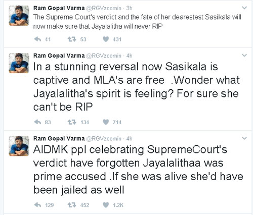 Hyderabad Feb 14 : Tollywood director Ram Gopal Verma is at it again and has made scathing attacks on Sasikala and the deceased former Chief Minister, J. Jayalalitha. " AIDMK people are celebrating the Supreme Court's verdict have forgotten Jayalalithaa was prime accused .If she was alive, she would have been jailed as well.