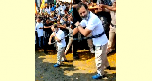 Hyderabad, Nov 3 (IANS) Congress leader Rahul Gandhi donned the role of Potharaju symbolically whipping himself during Bharat Jodo Yatra in Telangana's Sangareddy district on Thursday.
