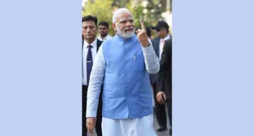 After emerging from the polling station, the Prime Minister showed his inked finger to the crowd gathered to welcome him.