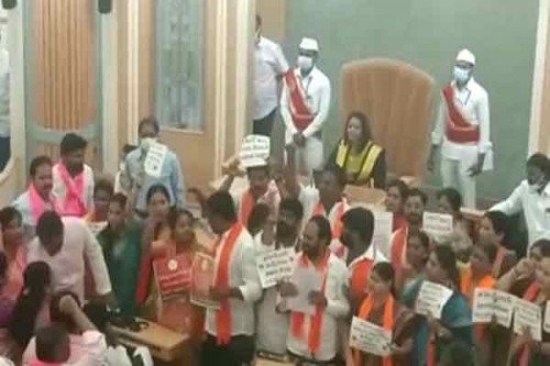As soon as the meeting began, the opposition corporators surrounded the mayor's podium demanding that their demands be taken up for debate. They were also carrying placards.