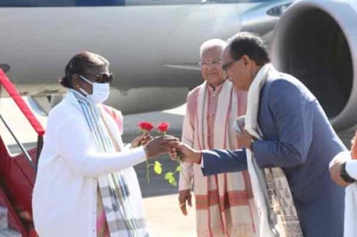 Bhopal, Jan 10 (IANS) President Droupadi Murmu was welcomed by Madhya Pradesh Governor Mangubhai C. Patel and Chief Minister Shivraj Singh Chouhan after she landed at Indore airport on Tuesday.
