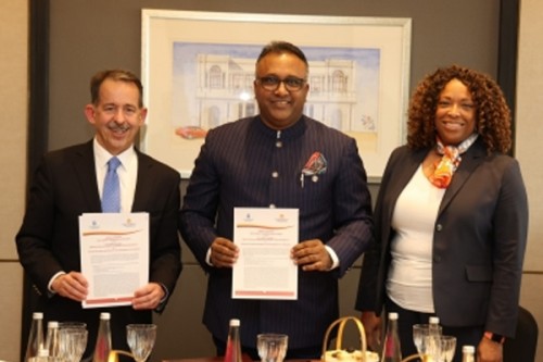 UVA Provost Ian Baucom and JGU Vice Chancellor Raj Kumar signed a Memorandum of Understanding (MOU) committing to the partnership during Kumar's visit to Charlottesville with five of JGU Deans and other senior staff.