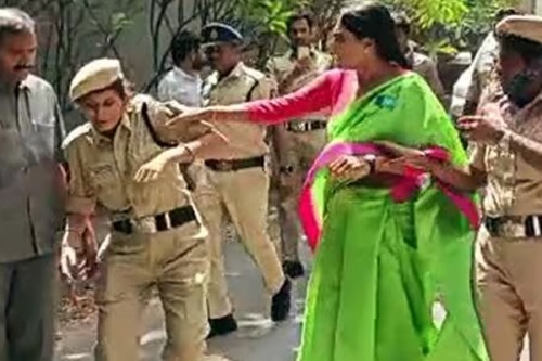 The YSRTP leader was taken to Jubilee Hills police station. Later, her mother Y. S. Vijayamma went to the police station to meet her. When she was stopped by the police, she had an argument with them. A video shows Vijayamma slapping a woman police constable.