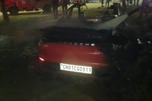 Gurugram, May 11 (IANS) A speeding Porsche sports car caught fire and was reduced to ashes after it hit a tree at Golf Course road early on Thursday, police said.