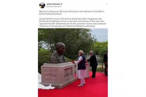 "Unveil Gandhi's bust in Hiroshima and 8 days later inaugurate new Parliament building at home on the birth anniversary of the man who opposed Gandhi vehemently all his life, and even worse, had profound influence on the people who killed the Mahatma ultimately," Ramesh, who is also the Congress communication in-charge said referring to the killer of Bapu, Nathuram Godse.
