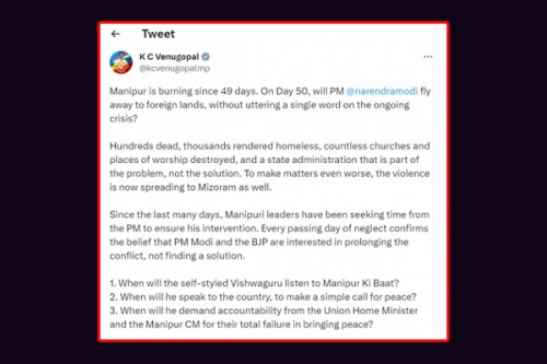 In a tweet, Congress General Secretary (organisation) K.C. Venugopal said, "Manipur is burning since 49 days. On Day 50, will PM Narendra Modi fly away to foreign lands, without uttering a single word on the ongoing crisis? Hundreds dead, thousands rendered homeless, countless churches and places of worship destroyed, and a state administration that is part of the problem, not the solution. To make matters even worse, the violence is now spreading to Mizoram as well."