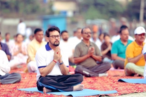 Shimla, June 21 (IANS) Union Sports Minister Anurag Thakur performed yoga in his hometown Hamirpur in Himachal Pradesh on Tuesday to mark the ninth International Yoga Day.