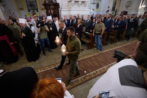 Kiev, July 10 (IANS) Ukrainian President Volodymyr Zelensky and his visiting Polish counterpart, Andrzej Duda attended a church service in the northwestern city of Lutsk.