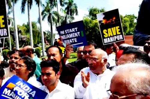 Carrying placards that read "India demands PM statement in both the Houses over Manipur", the leaders, under Indian National Developmental Inclusive Alliance (INDIA) led by Congress, also raised slogans against the BJP government over the violence in the northeastern state.