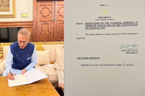 Islamabad, Aug 10 (IANS) Just three days before the completion of its five-year tenure, Pakistan President Arif Alvi has dissolved the National Assembly shortly after a summary signed by Prime Shehbaz Sharif advising the dissolution of the Lower House of Parliament, was sent to the Presidency.
