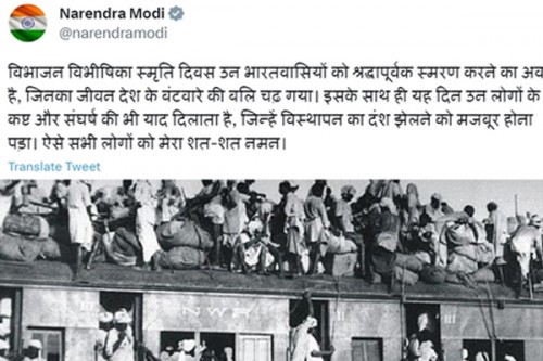 "Today, on 'Partition Vibhishika Memorial Day', I bow down to all those people who lost their lives and their family members due to partition." he also tweeted in Hindi.