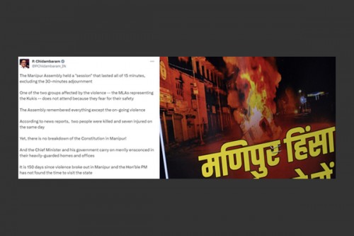 In a tweet, Chidambaram said: "The Manipur Assembly held a 'session' that lasted all of 15 minutes, excluding the 30-minutes adjournment. One of the two groups affected by the violence -- the MLAs representing the Kukis -- does not attend because they fear for their safety.
