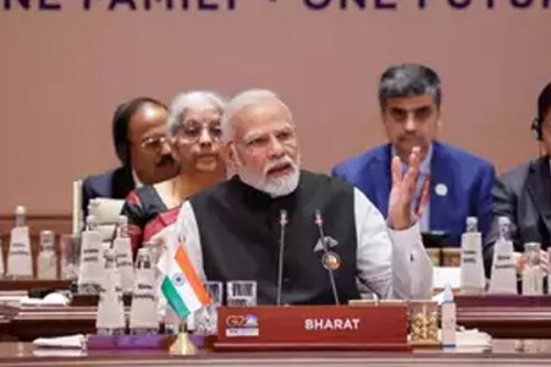 New Delhi, Sep 9 (IANS) Amid the debate over the India-Bharat, Prime Minister Narendra Modi on Saturday delivered his inaugural speech at the G20 Summit representing the 'Bharat' country tag in front of him.