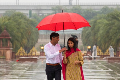 In a viral picture of Sunak and his wife, the couple can be seen sharing an umbrella, braving the rain. Rishi is seen donning a white formal shirt paired with royal blue colour pants. While Akshata wears an olive green floral printed kurta with pinkish red palazzos and matching dupatta.